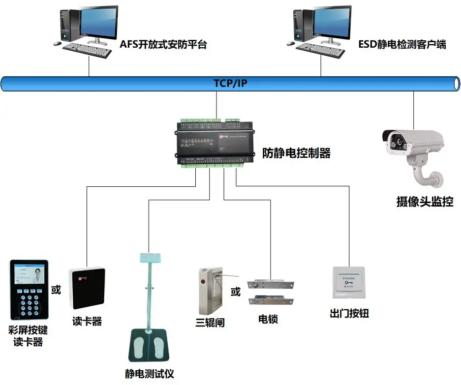 AFS-ESD集计算机技术、网络通讯技术、ESD 技术、自动控制技术和感应卡技术于一体,实现员工身份自动识别和静电测试快速通过。在电子产品生产领域,能有效提高电子产品合格率;在危化生产领域,能有效降低事故发生率。